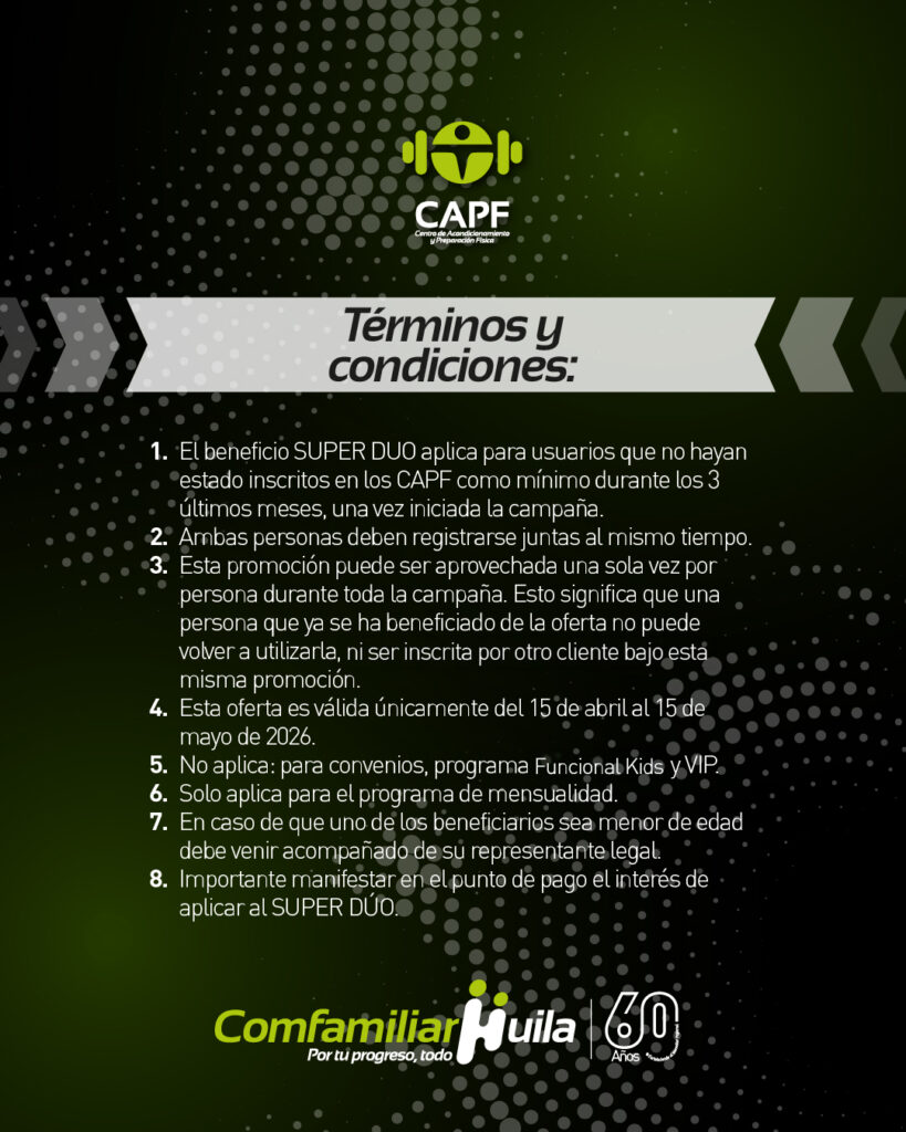 Esta campaña estará disponible del 15 de abril al 15 de mayo de 2026, con cupos limitados, en los Centros de Acondicionamiento y Preparación Física (CAPF) de Comfamiliar Huila, en sus sedes Norte, San Jorge y Oriente.