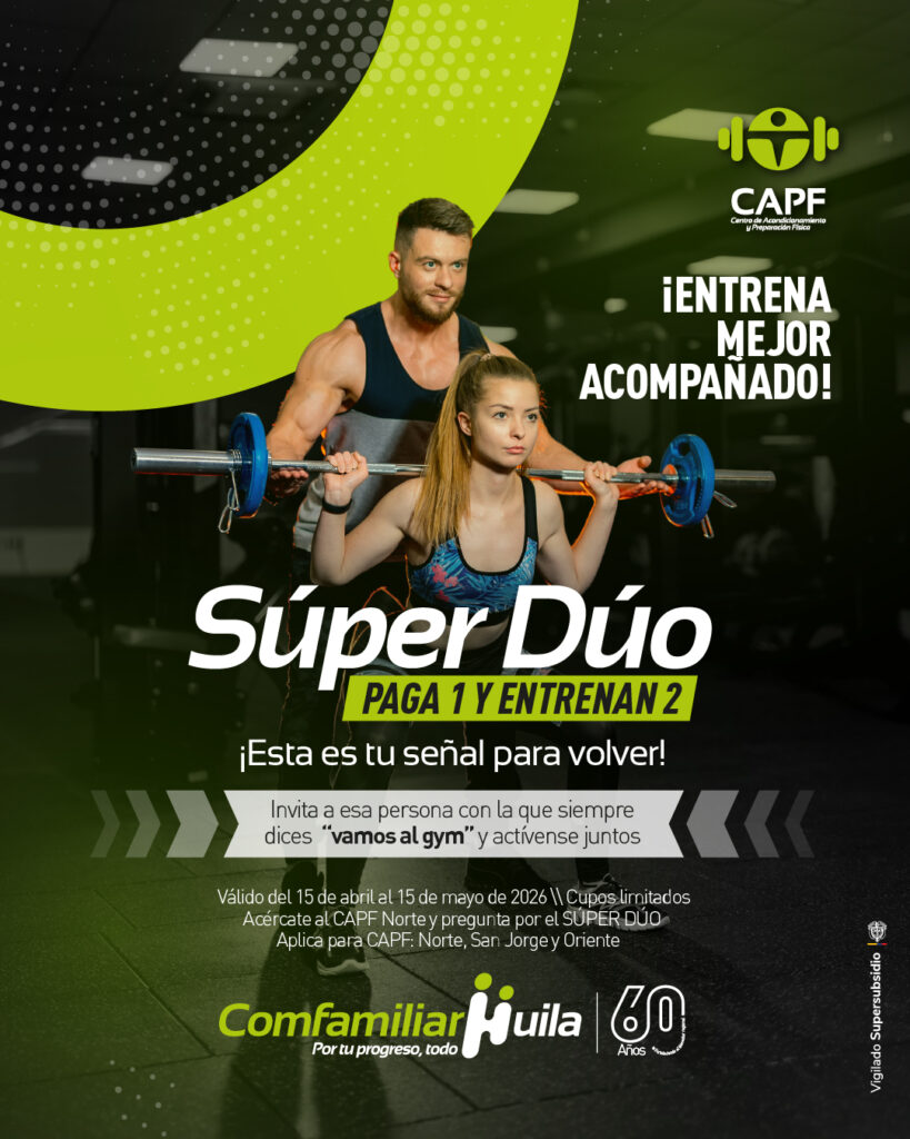 Comfamiliar Huila presenta una nueva forma de motivarte a volver al gimnasio: Súper Dúo, una campaña pensada para que entrenar sea más fácil, más divertido y, sobre todo, en compañía.