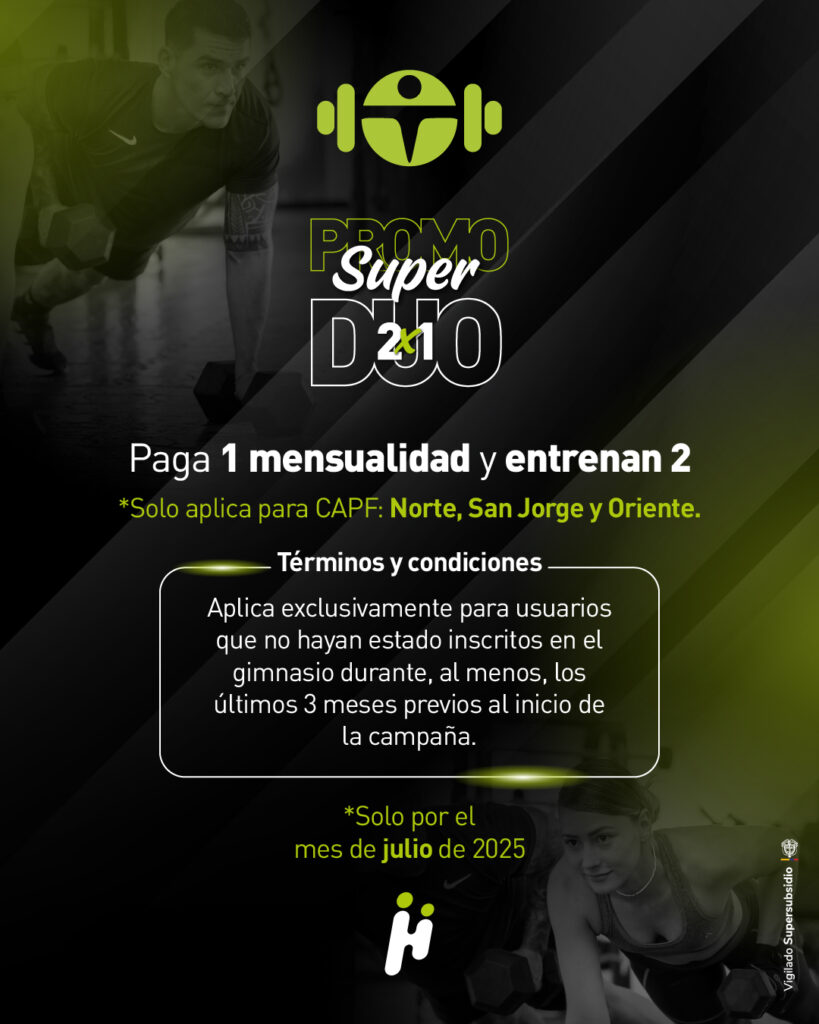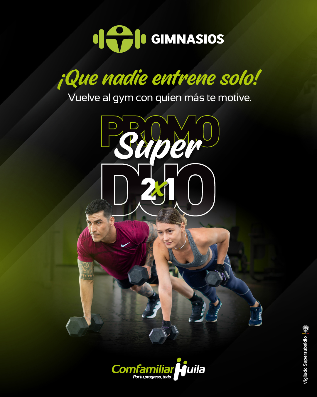 Vuelve al gym con quien más te motive. Durante el mes de julio de 2025, en Comfamiliar Huila queremos que nadie entrene solo. Por eso lanzamos SUPER DUO, una oportunidad ideal para retomar tus rutinas acompañado de quien más te inspire.